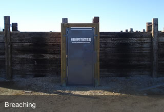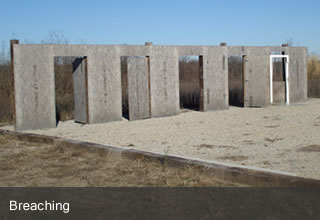 The 2300 square foot ballistic shoot house interior is configured with training flexibility in mind to allow for limitless training scenarios. The structure has three different approaches and three different entrances from the exterior. Each door is designed for a specific breach: shotgun, manual, mechanical and explosive. |